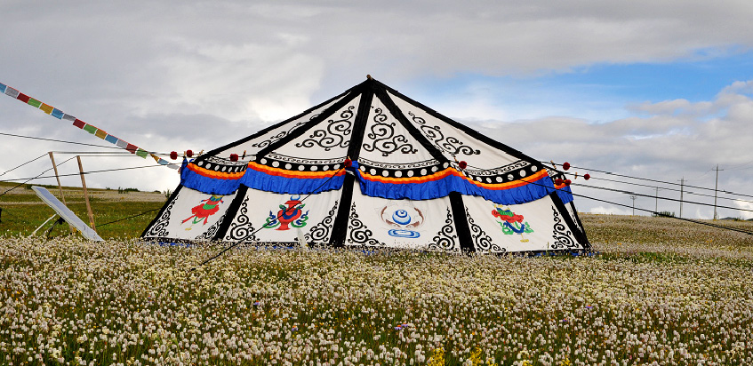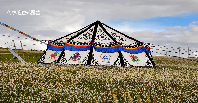 我们的帐篷营地就位于这美丽的花海之中,传统藏式风格的帐篷搭配舒适的充气床垫,以及精致的现代床品和洗漱用品为您在草原上营造一个温馨朴实的居所。您将会在悦耳的鸟鸣和曼妙的晨曦中醒来,窗外是辽阔的草原、清澈的河流和隐约的远山构成的美丽画卷。此外营地配备了餐厅帐篷、淋浴帐篷、以及厕所帐篷等设施,并配备太阳能发电装置。根据天气和日程安排,在营地周围还会举办小型的篝火晚会、藏族歌舞和马术表演。
