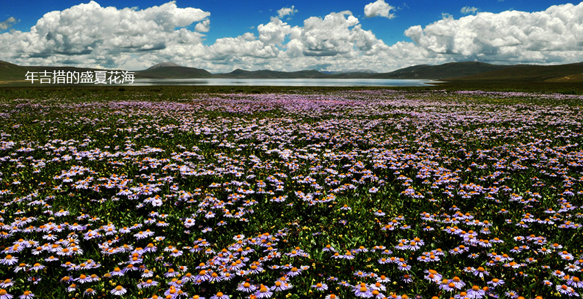 清晨的草原宁静而美丽,早餐后驱车前往年吉措湖欣赏壮美的草原花海(车程约120公里 /2.5小时)。每年7月至8月,湖畔的各种野花竞相开放,一群群斑头雁在清澈的湖面上荡起一圈圈涟漪,和远处隐约的山色构成一幅幅唯美画卷。抵达后,沿着湖畔漫步于南岸的花海,这里的花海辽阔壮观、赏心悦目。随后,来到湖的西岸,这里的花海更加艳丽,数不清的野菊花以及无名的小黄花遍布整个草原,蔚为壮观。
